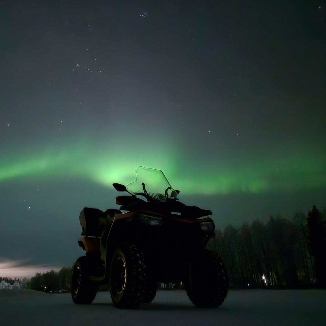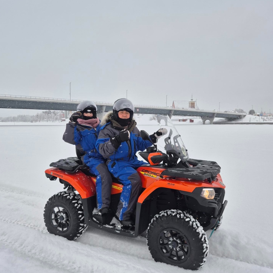 För dig som vill ha fart och spänning finns vårt ATV-safari på vintern, där vi glider fram över isen längs Kalixälven och vidare ut mot de öppna vidderna och Bottenvikens havsis. Med snön gnistrande under hjulen och den vidsträckta havsisen omkring dig får du känna friheten och äventyret på riktigt – en upplevelse som stannar kvar långt efter att dagen är slut.